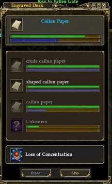 As the player crafted an item, they would encounter various events that would impede their progress. If you look below in the window you see the event “Loss of Concentration”. Each crafting profession gave the player a set of new abilities for their action bar, each with an icon that would correspond with a certain kind of event. To counter “Loss of Concentration”, the player would mash the corresponding button on their hotbar.