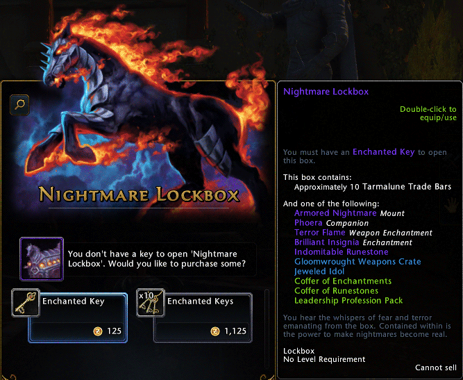 They can be pretty banal like the three free game tickets you get a month in Everquest 2, to extremely heinous like the hundreds and hundreds of items that can only be gotten through the 5 and 10 dollar cash boxes in SWTOR. Overall I have to say the ones in Neverwinter seem to be some of the most equitable. They do something that I first saw in EQ2, essentially every box contains an amount of currency, in this case Tarmalune bars. This currency can be then saved up and turned in to buy outright the various items contained in the box including the signature Armored Nightmare mount.