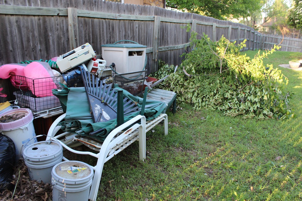 I had looked into the Bagster, which is a portable dumpster that you pick up at home depot, and then just call Waste Management to pick up when you were done. However while reading the reviews on Amazon, someone mentioned something they do instead. Basically they pile the stuff up in their yard and then call a junk and debris company to come get it. After a quick google I found the Junkman service, and that idea stuck. Basically you pile your crap up, and then they come load it up for you charging you based on volume. The cool thing about their service is that they will clean the area to the ground, and try to recycle everything they possibly can from your stuff. Seems like a win in all possible directions.