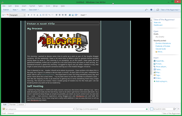 I’m using a little bit of blogception here, but this is a screenshot of me editing the post I am currently working on in Live Writer.  Ultimately when I decided to start writing I wanted it to be as fool proof as I could get.  On a daily basis I simply did not want to fiddle with anything… I wanted to be able to write up a post, post it, and get on with the day without a lot of tweaking.  Early on someone suggested to me Windows Live Writer, and I have been using it ever since.  If you are on Linux I know there are Drivel and Bloglio that work very similarly.  Basically it is Microsoft Word for your blog.