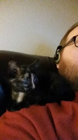 So after writing my blog post she decided to crawl up on my shoulder. I am officially in love, not that I wasn’t already. I have always wanted a shoulder cat to hang out with me while I game. Now she is curled up under the lapboard that my laptop is on grooming herself, but she spent a good long while on my shoulder. This is totally going to work out… we just have to somehow figure out a way to stop the nibbling. She seems to like to attack my beard and bite it right now. Which is adorable, but will eventually get to be frustrating and potentially painful.