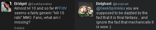 There is definitely something charming about the gameplay however. It feels like a much better version of World of Warcraft. The world looks nicer, the character models themselves are awesome… and the way combat chains off other abilities is a huge step forward from the WoW model. The world seems fairly intricate as well, with lots of little things to explore and find. I am still experience the whole things named nonsensically aspect… like what the hell is a Guildleve or a Levemete in the first place? It feels like when Americans try and make ethnic sounding names that end up just being gibberish. The whole game could do with a better cultural pass to change the names of things into something that makes sense. As a result I can never remember what anything is called and just end up making names up for them.