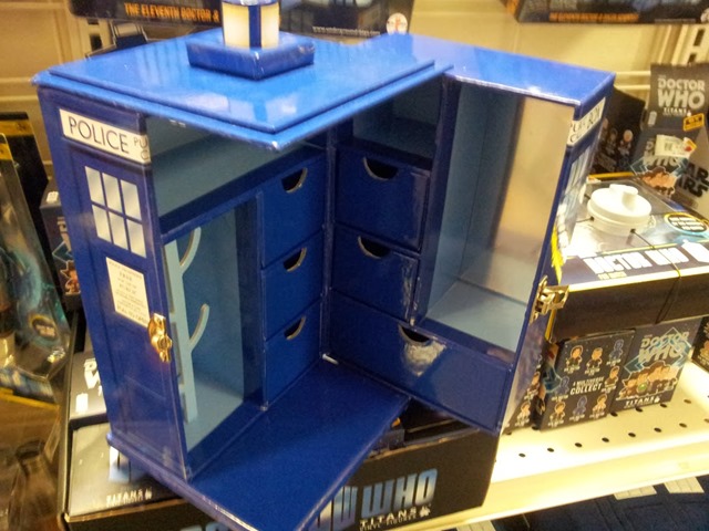 Yesterday we did in fact leave town and head up to Muskogee for the purpose of hitting as many of the little junkshops as we could find.  In theory we have been mostly looking for a very narrow cabinet to go behind the bathroom door and serve as a jewelry box, and lingerie and scarf storage.  We only have about 26 inches to work with, so it is one of those situations where we will know it when we see it.  As a result we are doing a lot of looking around.  At the local hastings I found the above Tardis Jewelry box that I submitted as an alternative…  but my wife didn’t really think that was the best option.
