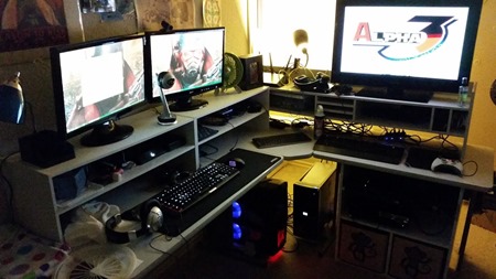 mynewsetup A week ago I posted an “in progress” shot of my office and this weekend I continued to refine it.  One of the side benefits of Saturday was getting a cabinet that would fit under the printer table, that now serves as my toolbox.  This allowed me to sort the various tools that I found while cleaning and organize them in one place.  Sunday however became the day I tackled hooking up the consoles again.  Below the television that is proudly displaying Street Fighter Alpha 3 (we will get to that in a bit) is a cabinet that contains my PS3, PS4 and Xbox 360.  I had to cut holes in the backing board of the cabinet to fish the cords through but in the end in works pretty well.  While I had my PS4 torn apart I also performed the upgrade from the stock 500 GB hard drive to a new Samsung 2 TB one…  and the nice thing about this setup is that it is close enough to the router that I can actually hard wire the network instead of relying on wireless for everything.  My hope is that this improves the performance of remote play through both the Vita and the PSTV.